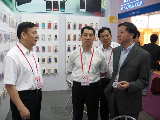 省國資委副主任朱少春(左三)、國貿(mào)集團(tuán)董事長范陽(左二)巡視公司廣交會展位