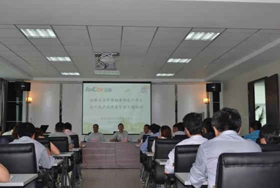 為進一步提升我省農(nóng)產(chǎn)品生產(chǎn)企業(yè)質(zhì)量管理水平,實現(xiàn)我省農(nóng)產(chǎn)品出口新突破, 5月24日,安糧實業(yè)外貿(mào)創(chuàng)意研發(fā)子平臺出口農(nóng)產(chǎn)品質(zhì)量管理專題培訓(xùn)活動在安徽外貿(mào)創(chuàng)意研發(fā)公共服務(wù)中心如期舉行。包括安糧實業(yè)子公司在內(nèi)的21家農(nóng)產(chǎn)品生產(chǎn)企業(yè)分管質(zhì)量的負責(zé)人和品質(zhì)管理人員參加了此次培訓(xùn)活動。省商務(wù)廳機電和科技產(chǎn)業(yè)處處長戴傳裕、省出入境檢驗檢疫局植檢處處長李寒松和動檢處副處長邵建明、安糧控股副總裁葛志毅、安糧實業(yè)副總經(jīng)理何勤參加活動并講話。