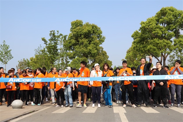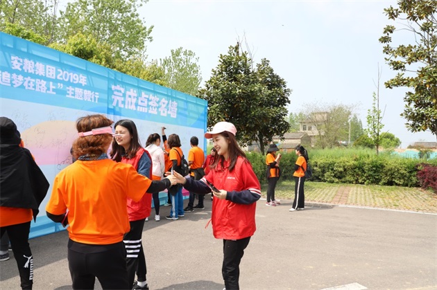 一路上,統(tǒng)一著裝的毅行隊(duì)伍如一股橙色的春潮,激蕩在碧波萬頃、楊柳接岸的巢湖之濱。伴著融融春日,吹著習(xí)習(xí)微風(fēng),毅行隊(duì)伍一邊暢享行走的樂趣,一邊欣賞大美巢湖的秀麗春色,一邊笑談工作或生活的點(diǎn)滴。上午10點(diǎn)5分,來自安糧實(shí)業(yè)的薛寶第一個(gè)沖破終點(diǎn)線,隨后,其他毅行者也陸續(xù)抵達(dá)終點(diǎn)。大家在留言墻上簽名并合影留念,一張張笑臉洋溢著成功的喜悅。