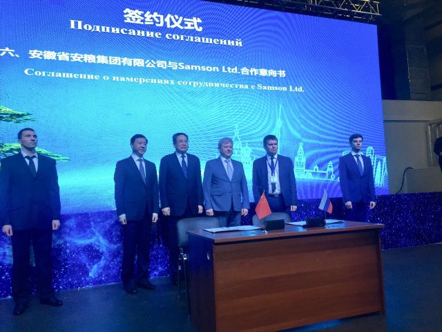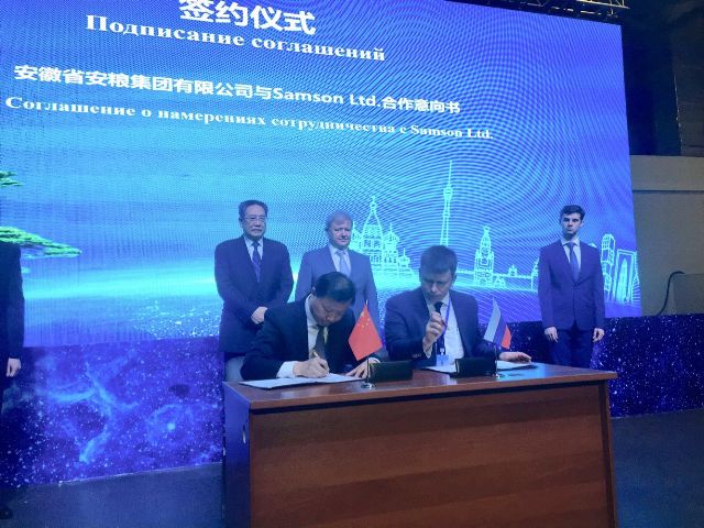 簽約儀式上,曹訓(xùn)立董事長代表安糧集團與俄羅斯知名連鎖超市Samson Ltd.代表 Ilya Chekanov 先生簽署了雙方在深化合作擴大貿(mào)易額、電商業(yè)務(wù)的拓展以及Samson公司為安糧集團橋接當(dāng)?shù)刭Y源向中國進口的戰(zhàn)略合作意向書。