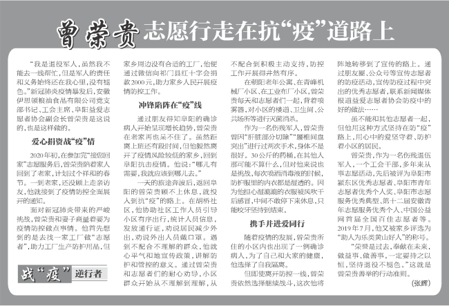 黃山人曾榮貴是安徽伊思頓糧油食品有限公司黨支部書(shū)記,他是一名傷殘退伍軍人,擔(dān)任阜陽(yáng)益愛(ài)志愿者協(xié)會(huì)副會(huì)長(zhǎng),曾積極參與過(guò)大小百余次公益活動(dòng),被評(píng)選為“助人為樂(lè)黃山好人”稱(chēng)號(hào)。在今年新冠病毒蔓延的特殊時(shí)期,曾榮貴不僅捐資戰(zhàn)“疫”,更沖鋒在前。正月初一,他就協(xié)同當(dāng)?shù)卮鍍晌e極投入到防控疫情一線,白天走進(jìn)村委會(huì)和公共場(chǎng)所開(kāi)展防疫消毒,幫助村兩委工作人員開(kāi)展出入人員管控;晚上編輯公眾號(hào)文章,宣傳防疫活動(dòng)和防疫過(guò)程中的好做法,用行動(dòng)踐行了共產(chǎn)黨員的初心使命,發(fā)揮了黨員的先鋒模范作用。