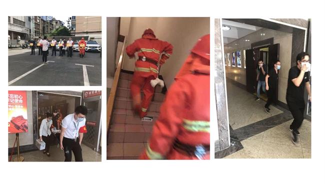 按照演習安排,監(jiān)控中心監(jiān)控員接到火警報告,大廈12樓貨梯口發(fā)現(xiàn)火情,通知巡邏崗隊員立即到報警現(xiàn)場確認,巡邏崗到達現(xiàn)場發(fā)現(xiàn)大廈12樓失火。滅火組攜帶滅火器材、破拆工具趕到火災現(xiàn)場進行撲救。疏散組迅速按緊急預案的疏散線路帶領業(yè)主們,捂住口鼻,壓低身子,有序撤離。同時,救護組在濃煙中救出被困傷員,進行緊急救治,現(xiàn)場做到了快速、安全、有序。