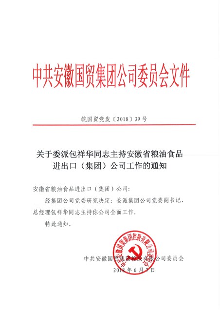 按照會議安排,首先由李明輝同志受國貿(mào)集團黨委委托宣讀《關(guān)于委派包祥華同志主持安徽省糧油食品進出口(集團)公司工作的通知》,包祥華同志、范陽同志先后講話。