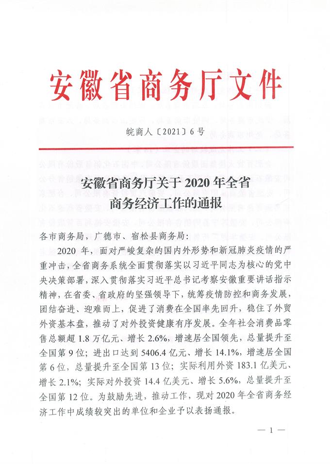 全省商務(wù)工作電視電話會議2021年1月21日上午在合肥召開。會上,省商務(wù)廳張箭廳長對2020年全省商務(wù)經(jīng)濟(jì)工作中成績較突出的單位和企業(yè)予以表揚(yáng)通報。