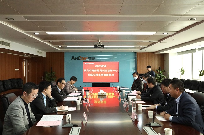 周洪副總裁對王局長一行的到來表示歡迎,并介紹了公司的發(fā)展歷程、業(yè)務(wù)板塊及2020年經(jīng)營情況。王局長簡要介紹了泰安市發(fā)展情況以及當(dāng)?shù)靥厣a(chǎn)品,提出希望發(fā)揮雙方平臺優(yōu)勢,拓寬與安糧集團(tuán)的合作空間。雙方與會人員就農(nóng)產(chǎn)品研發(fā)、產(chǎn)業(yè)化建設(shè)及推動當(dāng)?shù)赝庀蛐徒?jīng)濟(jì)發(fā)展等方面展開了深入的交流討論。