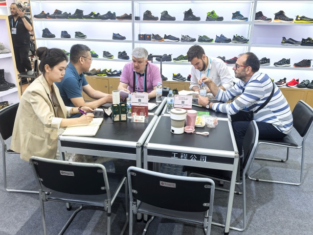 鞋類展區(qū)以“創(chuàng)新科技,時尚出行”為主題,集中呈現了運動休閑、戶外功能等多類產品。主打的輕便安全鞋采用先進的減震與防護技術,兼具輕量化與高強度特性,獲得歐美客戶的高度認可,開展首日就迎來大量客戶詢價洽談;使用環(huán)保耐磨材料制成的雪地靴,憑借出色的保暖與防滑優(yōu)勢,成為北歐市場的潛力爆品。
